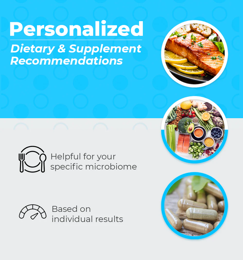 Recibe sugerencias de alimentos, suplementos y pre/probióticos adaptadas a tu perfil microbiano para intervenir de forma práctica.