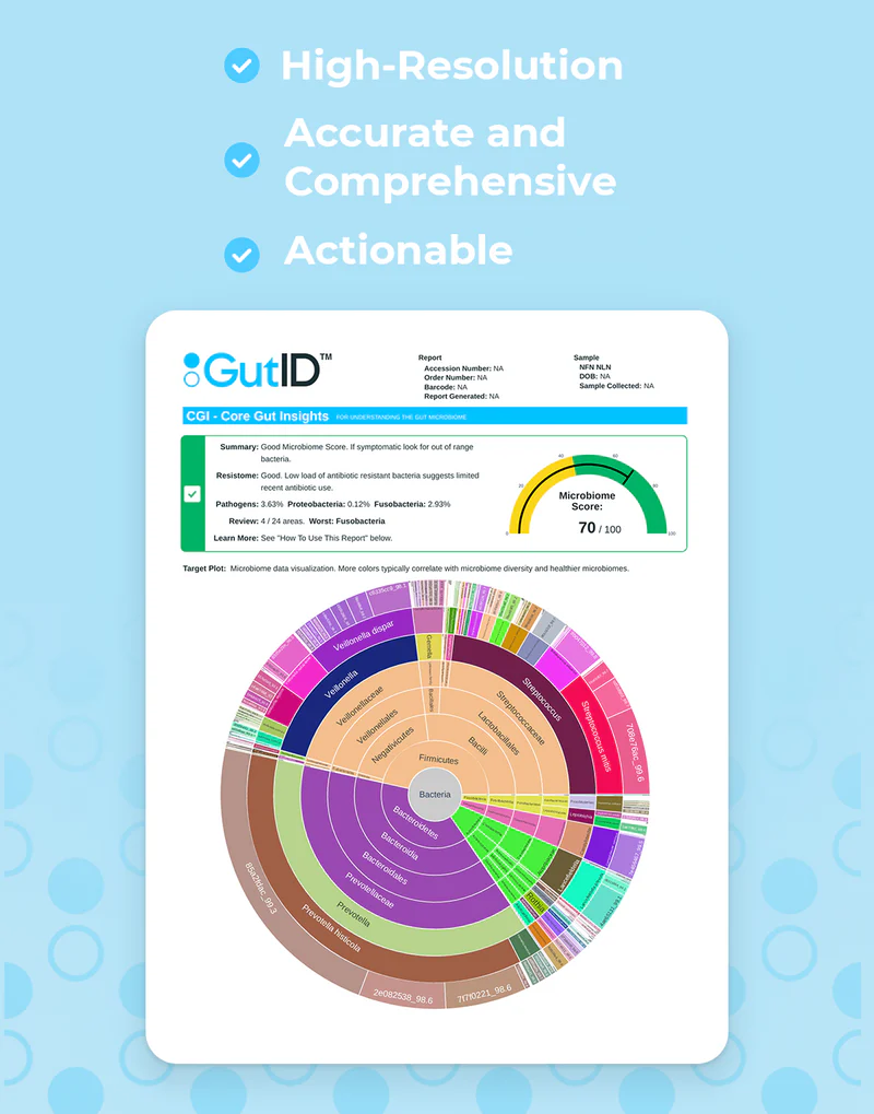 Kit de prueba del microbioma intestinal en casa que utiliza tecnología de secuenciación de ADN Titan-1™ y análisis con inteligencia artificial para identificar tu microbioma hasta el nivel de cepa. Ofrece datos claros y accionables sobre bacterias beneficiosas, posibles patógenos, diversidad microbiana (riqueza, uniformidad, resiliencia), resistoma (resistencia antibiótica) y marcadores de salud digestiva relacionados con IBS, SIBO, IBD, metabolismo de nutrientes y función de la mucosa intestinal.