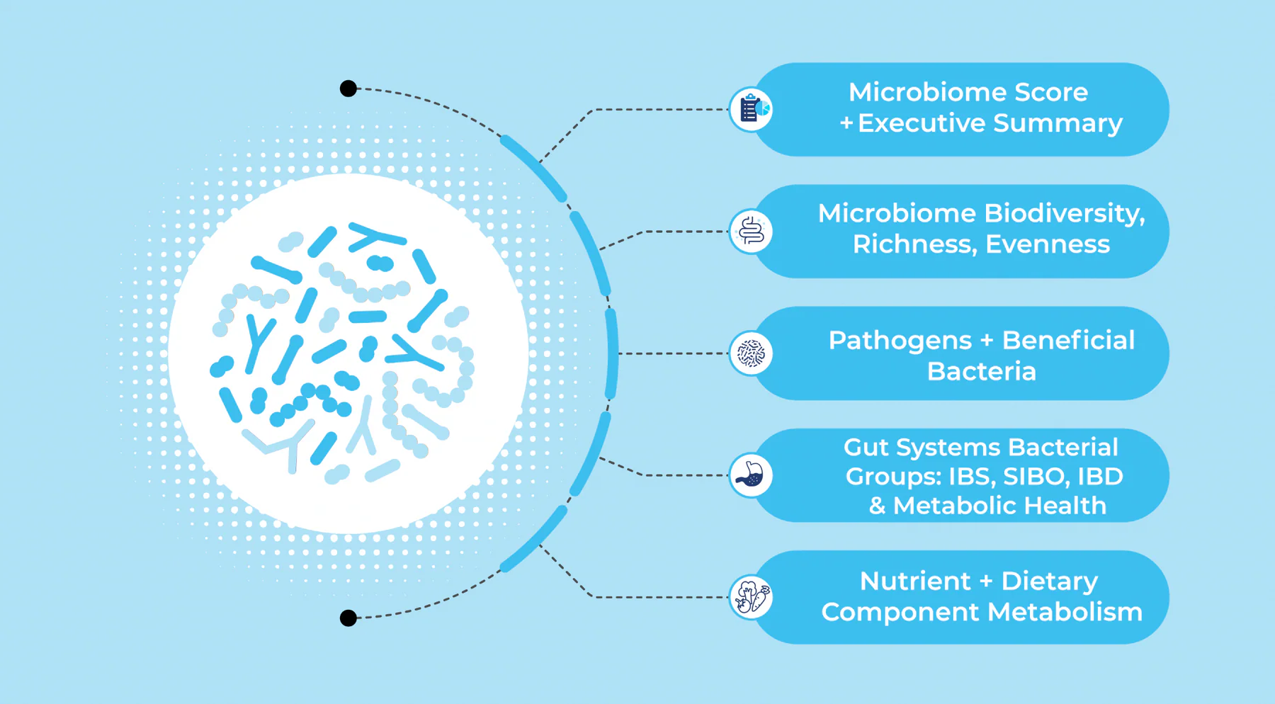 Evalúa diversidad, riqueza, uniformidad y resiliencia, resistoma antibiótico, bacterias beneficiosas y patógenos; además señala riesgos relacionados con IBS, SIBO, IBD, metabolismo y función de la barrera intestinal.
